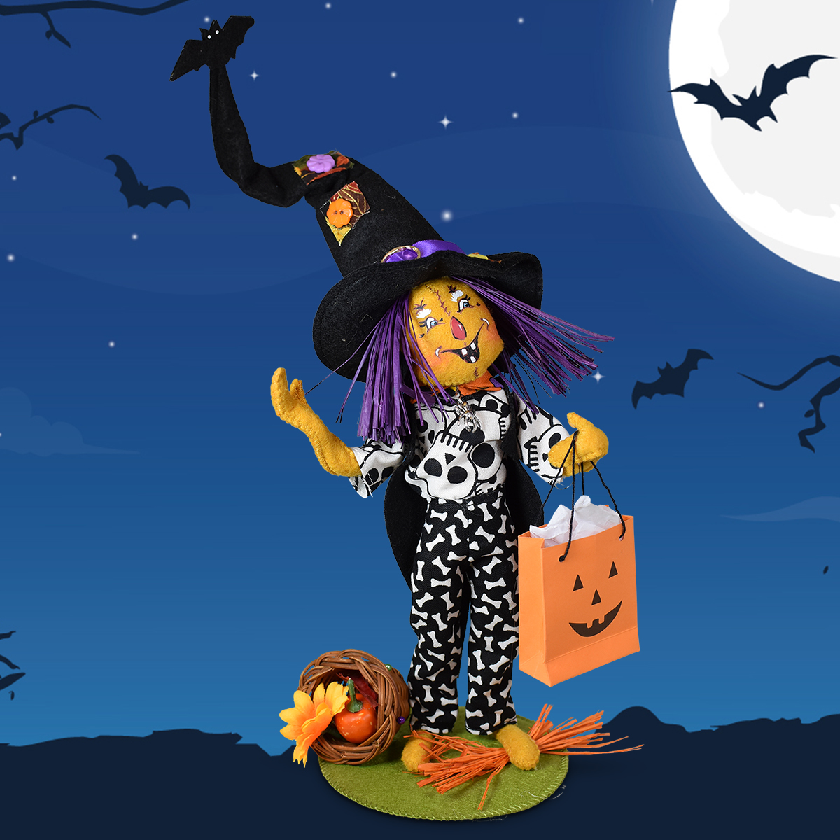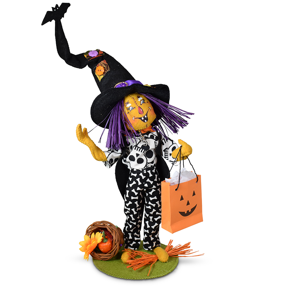 Thanks to your votes, Joshua’s design was brought to life by our Annalee elves as a 100-only exclusive collectible. We even asked him to name the design. It is now known as Mr. Bone-jangles, which we think is simply prefect. This fun and festive fall figure made his debut on October 9, 2025. He was dressed to impress in bone-patterned pants, a skull-print shirt, and a dash of spooky charm.