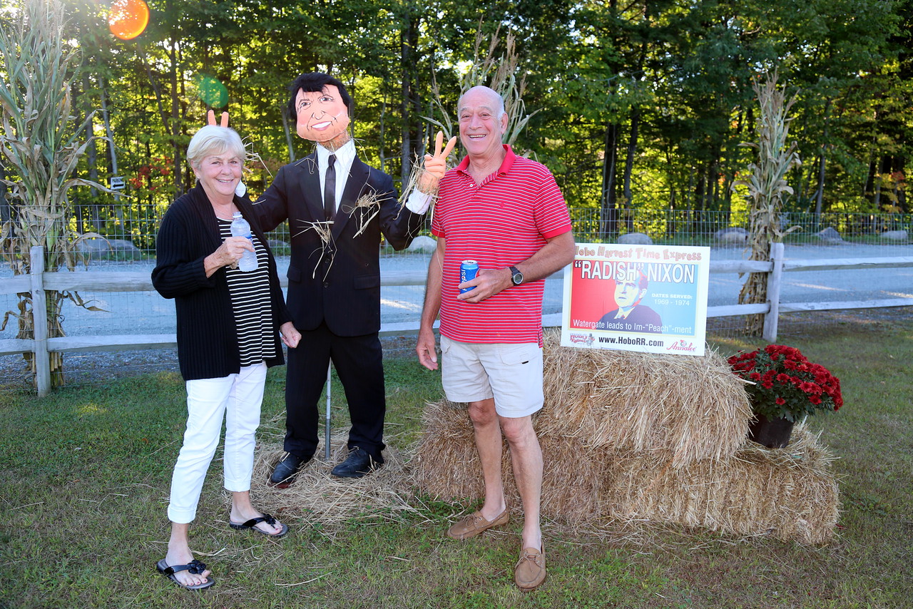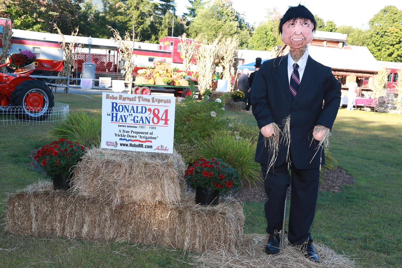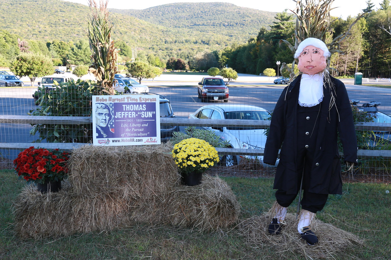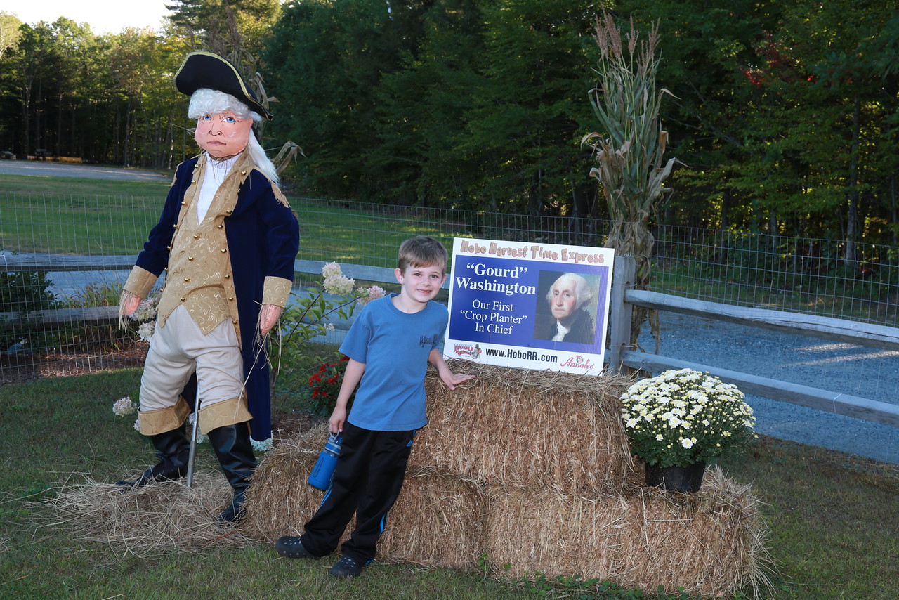 From September 17th through October 16th, the Hobo Railroad of Lincoln, NH will be hosting their “Hobo Harvest Time Express” event. During this time their property takes on an entirely new look! First, there is the addition of a farm stand stocked with New Hampshire made products along with a farm yard full of games for all ages. Patrons can enjoy things like pumpkin bowling, ring toss, horse shoes, bean bag toss, sack races and corn hole. There is also an antique tractor display. For the past three years, Annalee has been helping the folks at the Hobo Railroad by building the “Cornstalk Critters” that also decorate their farm yard. These life sized scarecrows make fun photo ops for everyone stopping by!