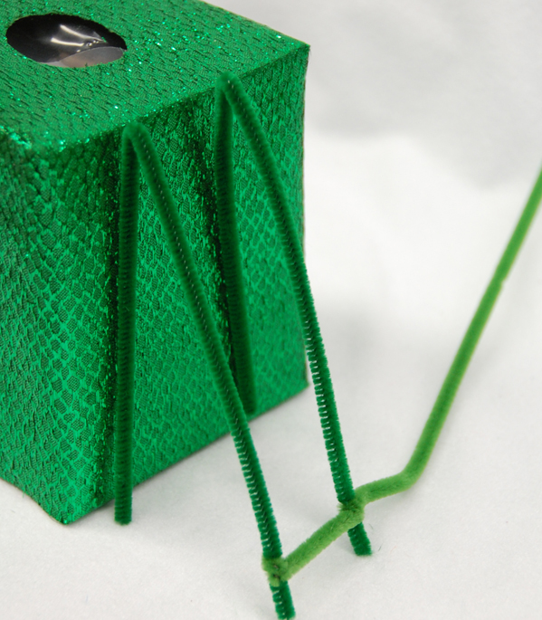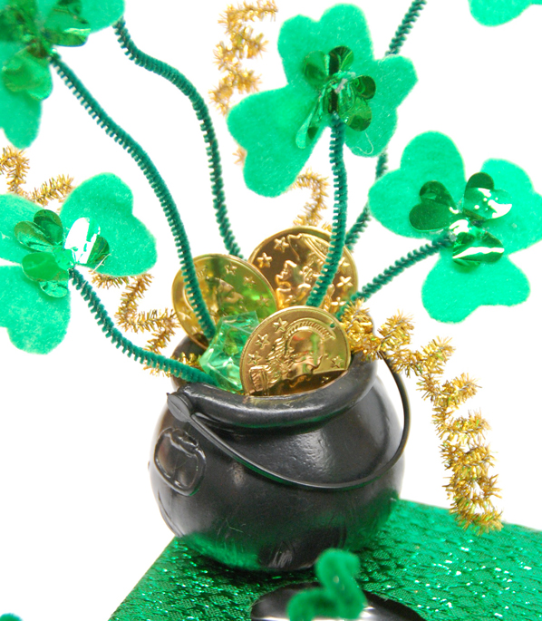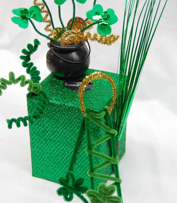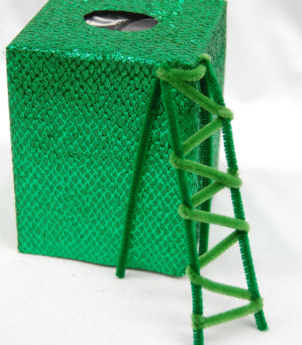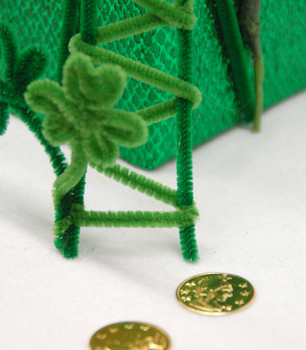 THINK GREEN- both for color and for items’ reusability qualities! Choose a container that will be used as the primary trapping device and then some other things to decorate it with. We’ve used some simple doodads like pipe cleaners, shiny fabric, green cello (like the grass inside an Easter basket) and gold coins to use as bait!