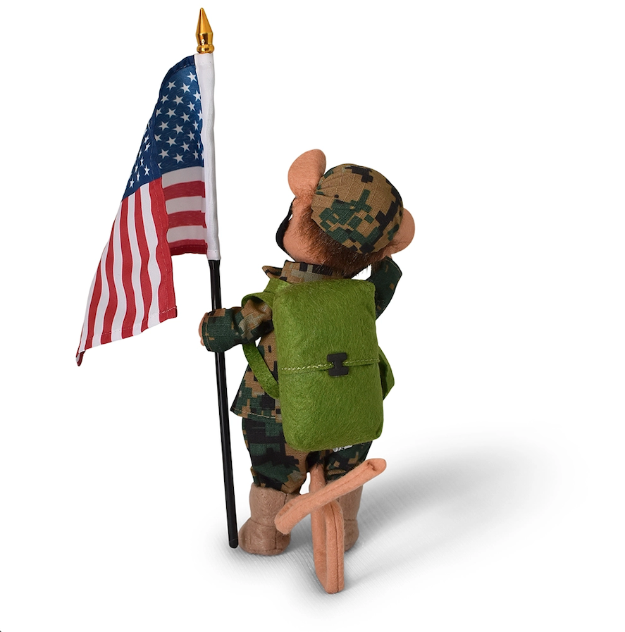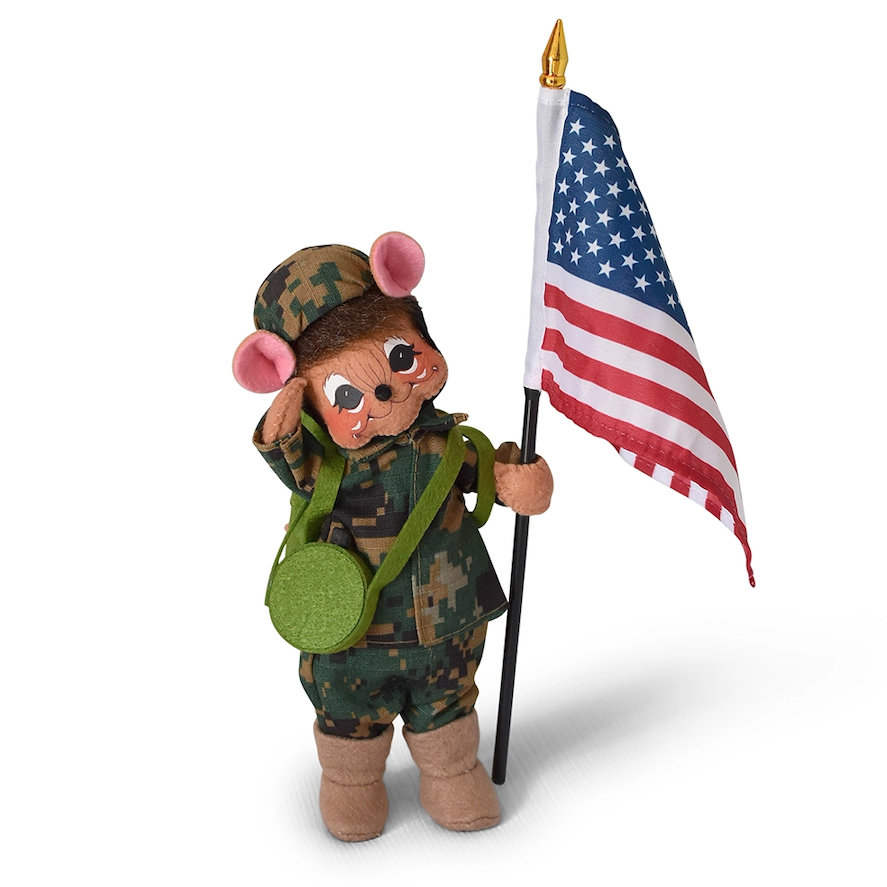 To commemorate all soldiers, both past and present, the elves have designed a new 8-inch Soldier Mouse. He stands tall and proud, holding an American flag, and wears camouflage fatigues and helmet and tan felt boots. His accessories include a canteen and a backpack, both made of felt.