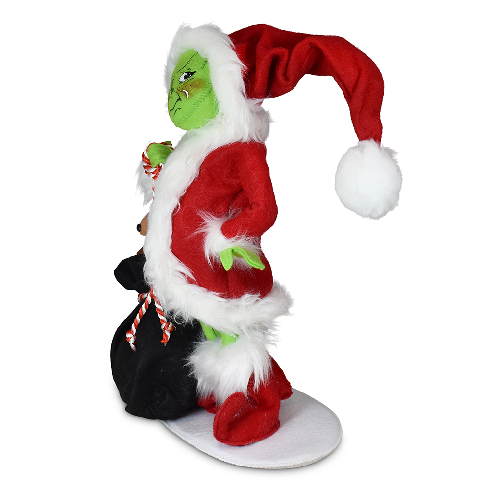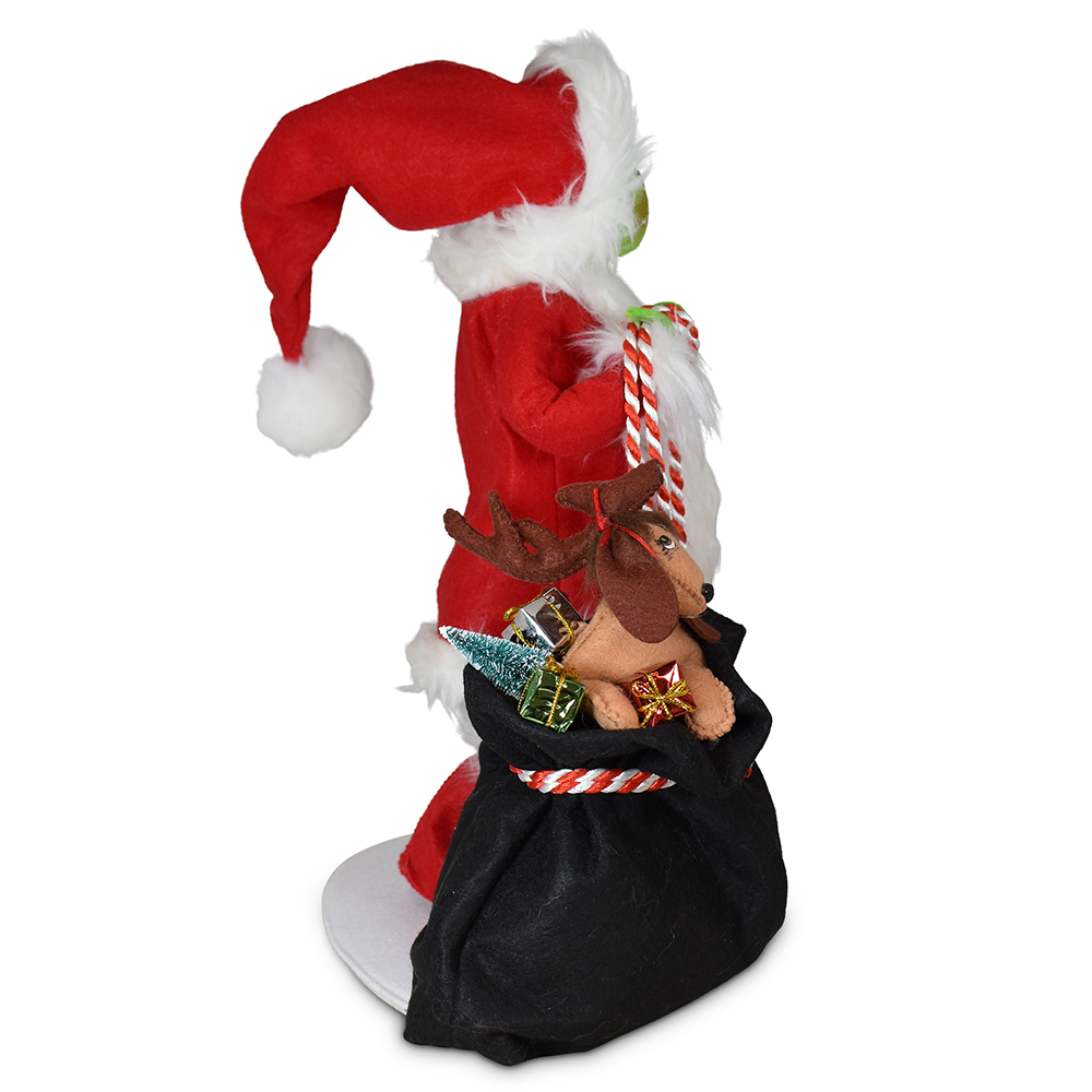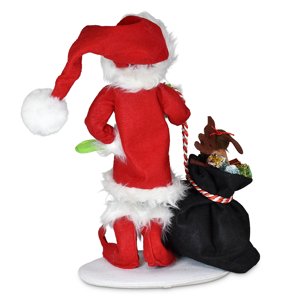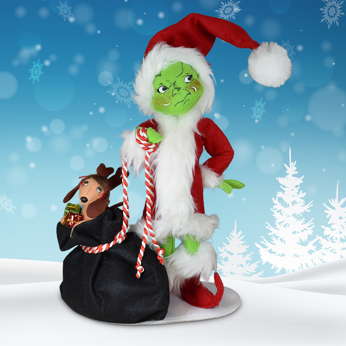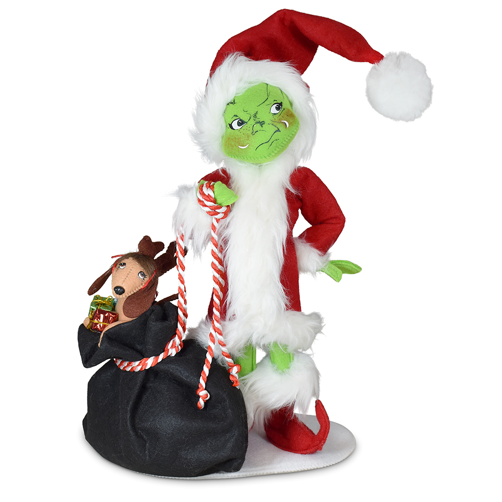 Stealing the spotlight (and maybe a few stockings along the way), our 14in Mean Fellow & Max collectible doll brings a mischievous sparkle to your holiday collection! Dressed in a bright red felt Santa suit with fluffy white trim, this grumpy charmer struts about in matching boots and a floppy hat, clutching his trusty black Santa sack overflowing with stolen gifts and trees. Peeking of the top is his loyal sidekick Max with a gift in paw, sporting his iconic single reindeer antler like the good-natured pup he is. Whether plotting playful pranks or secretly warming up to the holiday cheer, this festive duo captures the magic of whimsy, wonder, and a pinch of mischief—all wrapped up in Annalee charm.