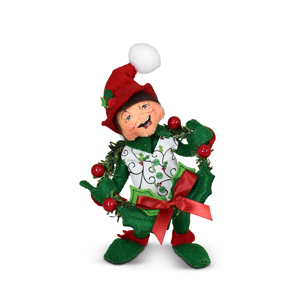 • This 5-inch Holly Jolly Wreath Elf is wrapped up in holiday fun—literally! Dressed in cheerful green with bright red cuffs and a matching red hat, he brings just the right amount of festive contrast. His vest, made from our signature holly jolly fabric, ties his whole merry look together.