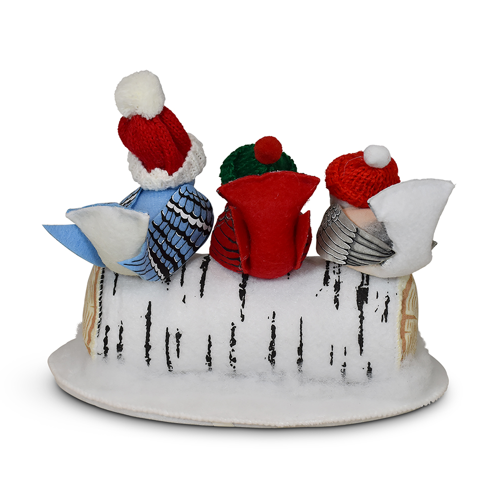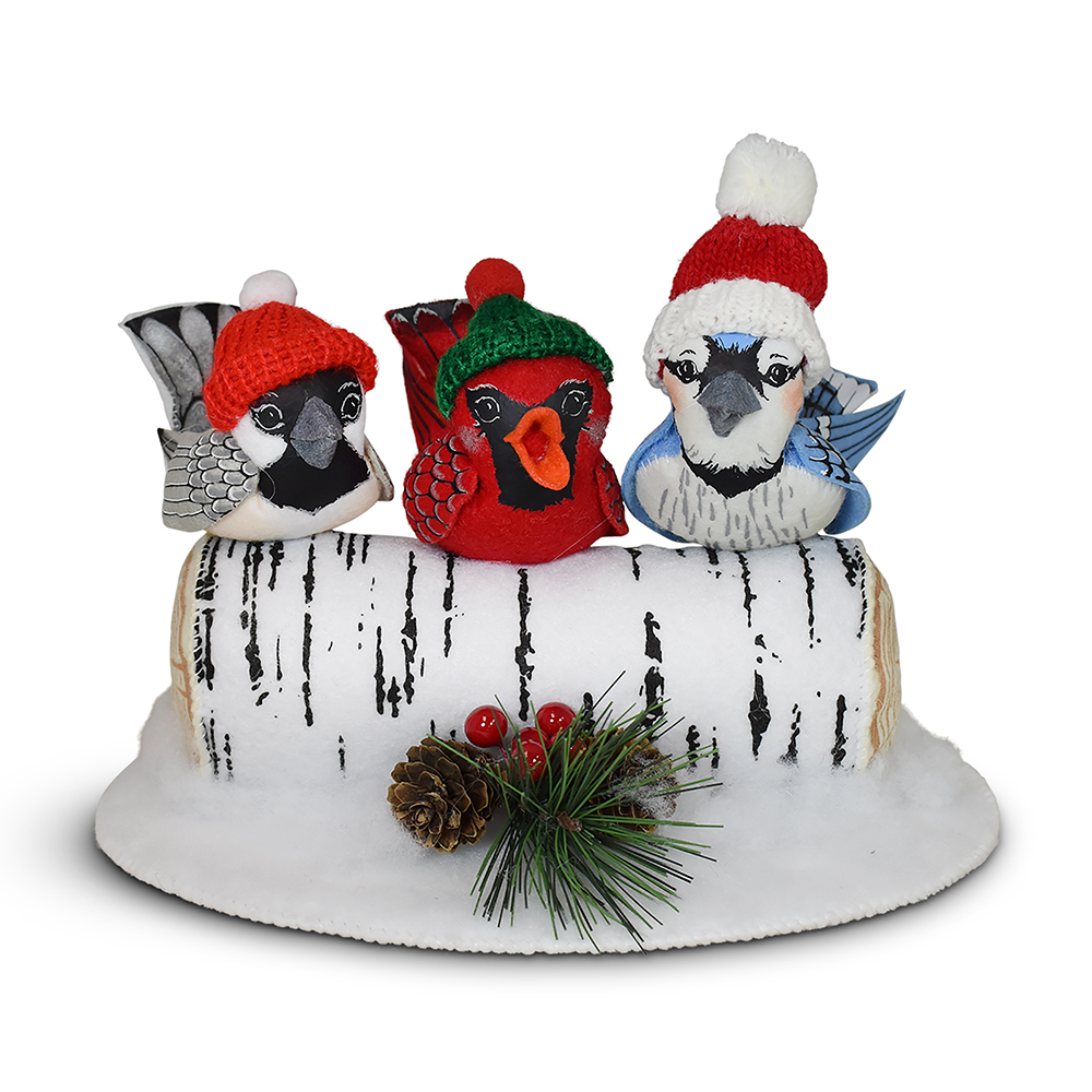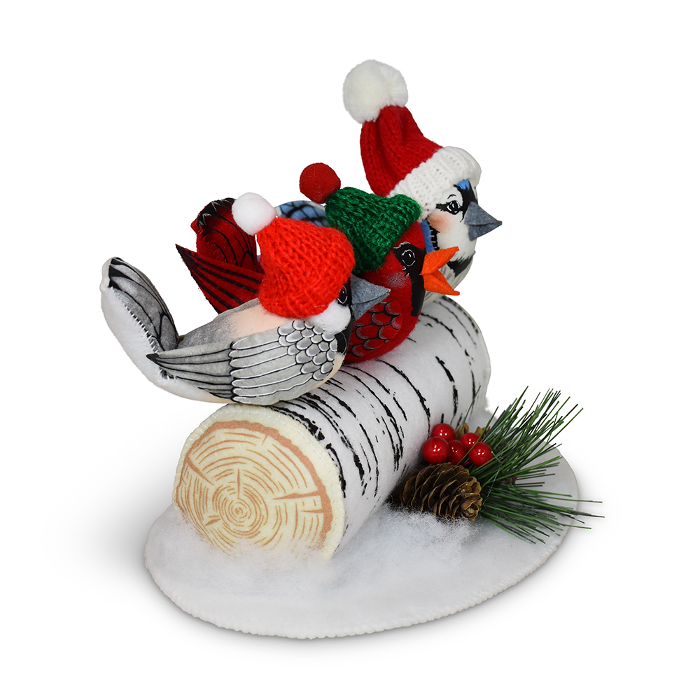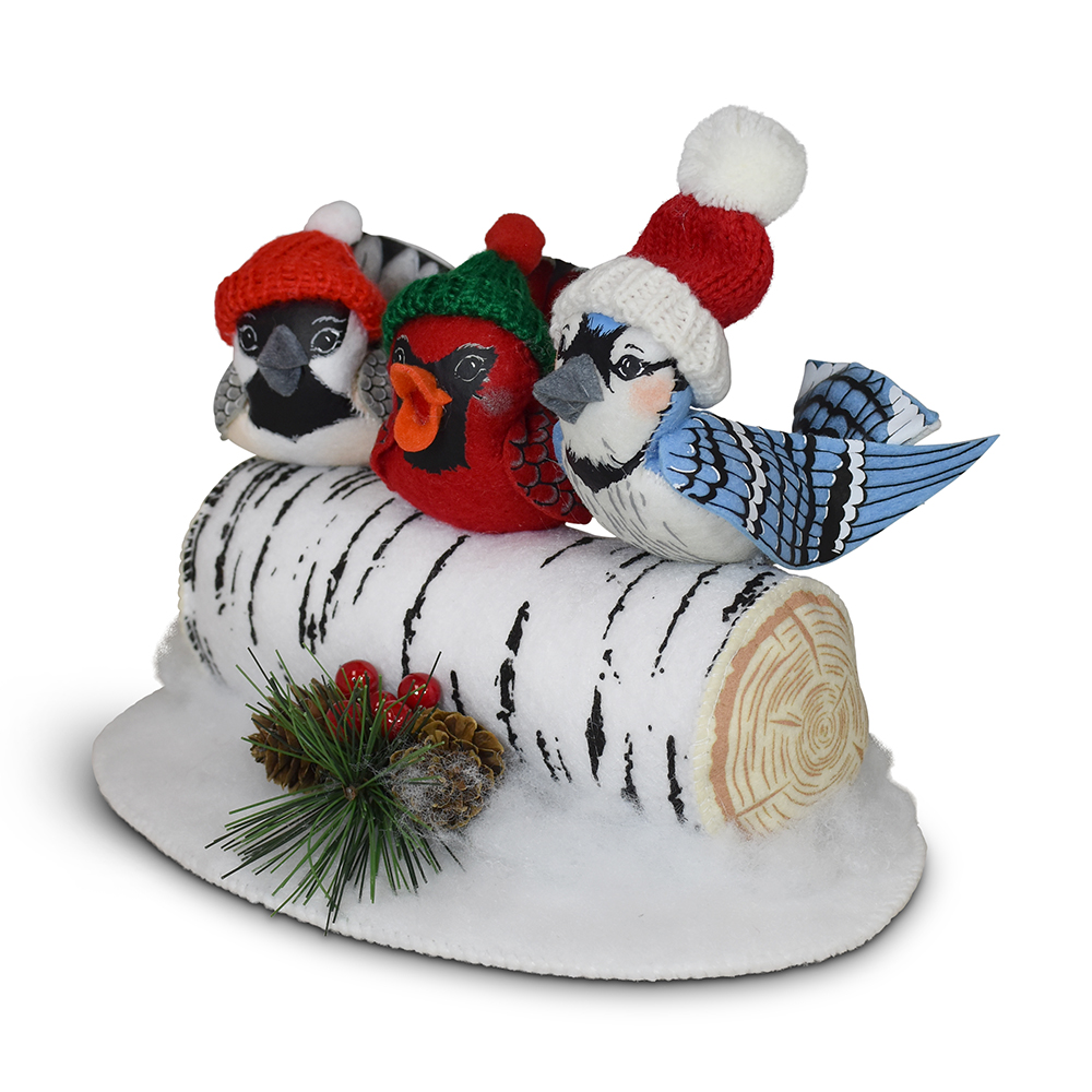 - Chirping in the cheer of the season, our 6in Winter is for the Birds exclusive design is a joyful gathering of feathered friends! A a merry chickadee, a bright red cardinal, and a dapper blue jay perch together on a cozy birch log, bundled up in their finest winter wear. With their adorable tiny winter hats, these songbirds are ready to serenade the snowflakes and spread a little woodland wonder. From their rosy cheeks to their perky tails, each detail flutters with handcrafted charm—reminding us all that friendship (and a good scarf!) makes even the frostiest days feel warm.