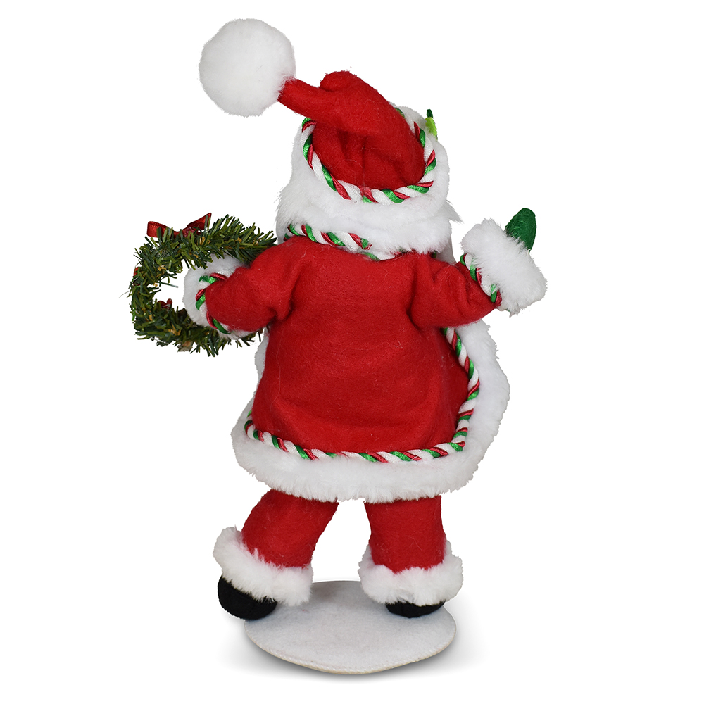 - Bring festive cheer to your holiday décor with the jolly 9-inch Snowy Day Santa! Dressed in classic red overalls and a cozy coat with soft fur trim. The green and white striped fabric lining adds a playful twist and extra charm.