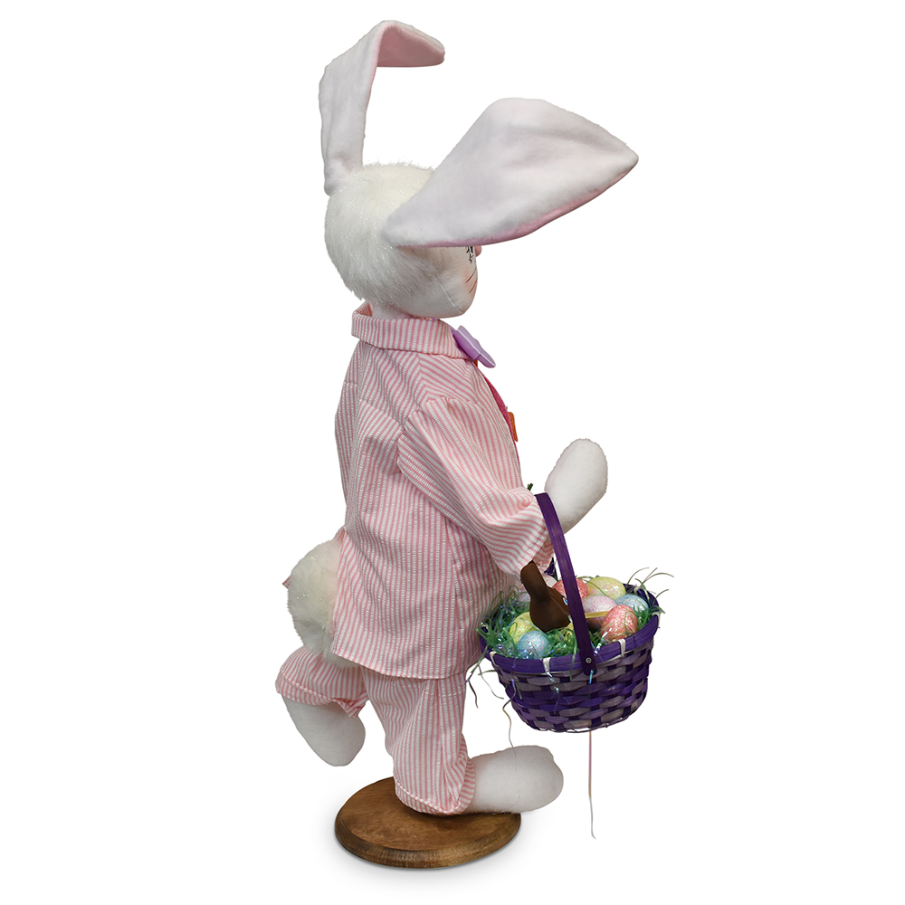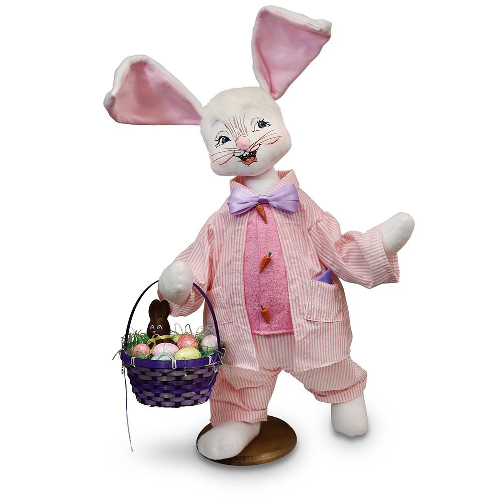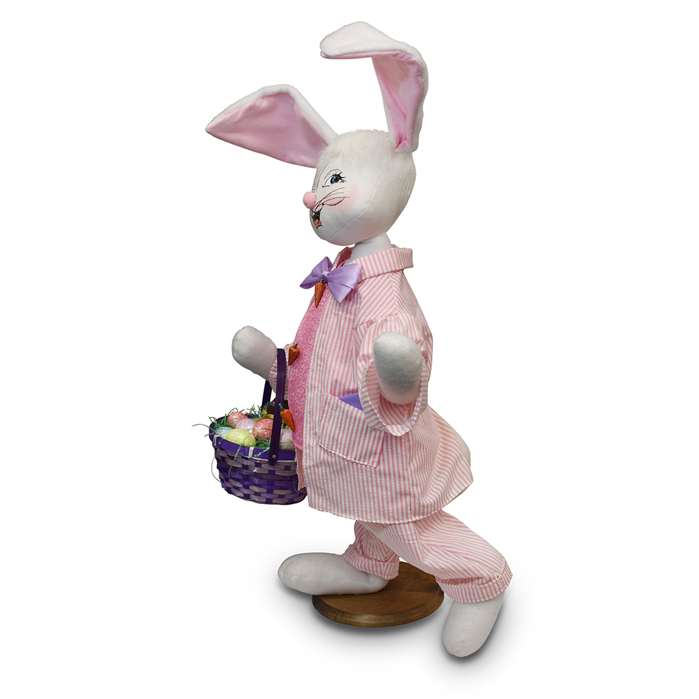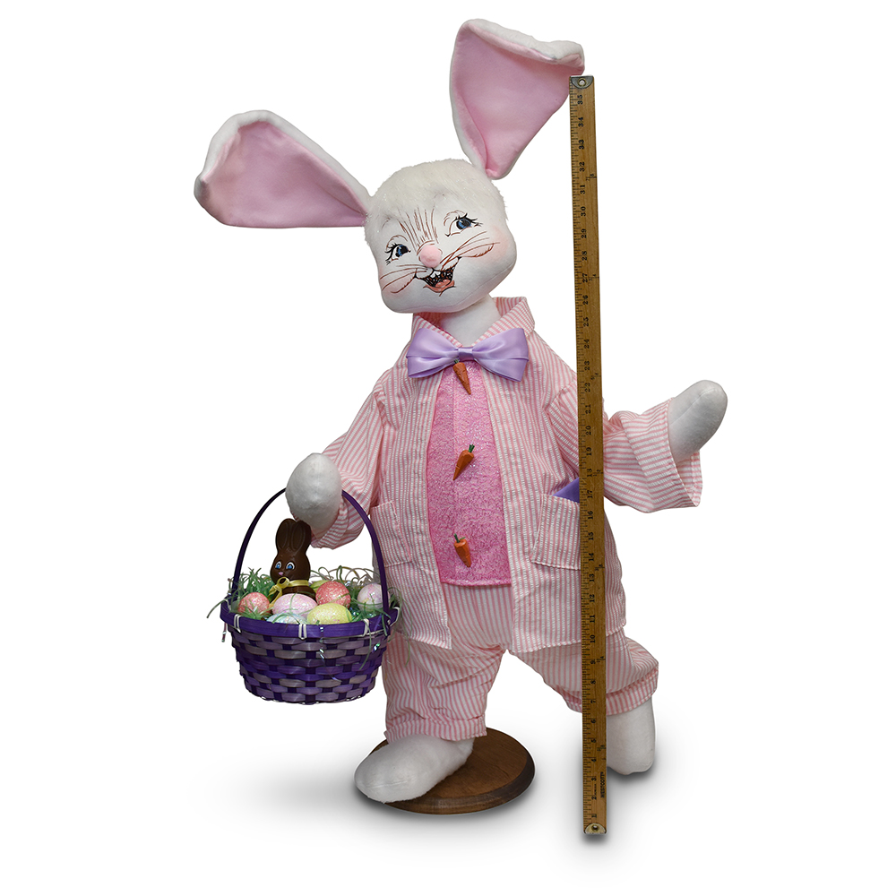 Take a hop down the Easter path with this charming one-of-a-kind 30in Easter Bunny, a delightful design brimming with springtime cheer! Dressed in a dapper pink and white striped seersucker outfit with adorable carrot button accents and a lavender bow tie, this handsome bunny looks ready for a day of Easter merriment as he strolls along delivering treats and smiles to children far and wide.