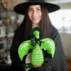 - The 12 inch dragon is lime green and black and has wonderful artwork on his belly, hands, feet and wings! He wears a witch hat made from our signature spooky sublime fabric with a black netting overlay.
