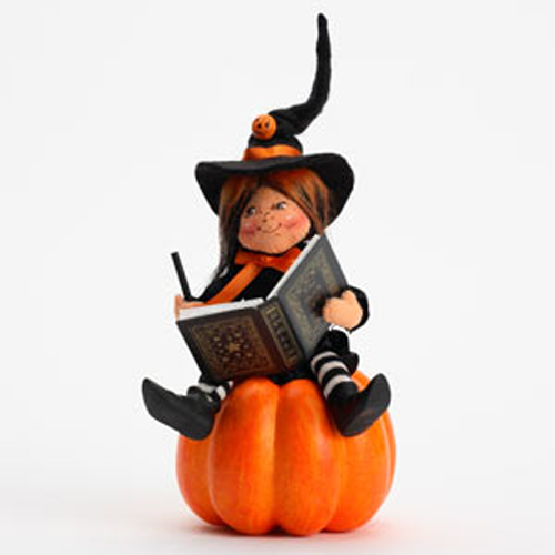 This happy little witch kid sits atop a pumpkin she’s ready to practice her spells!