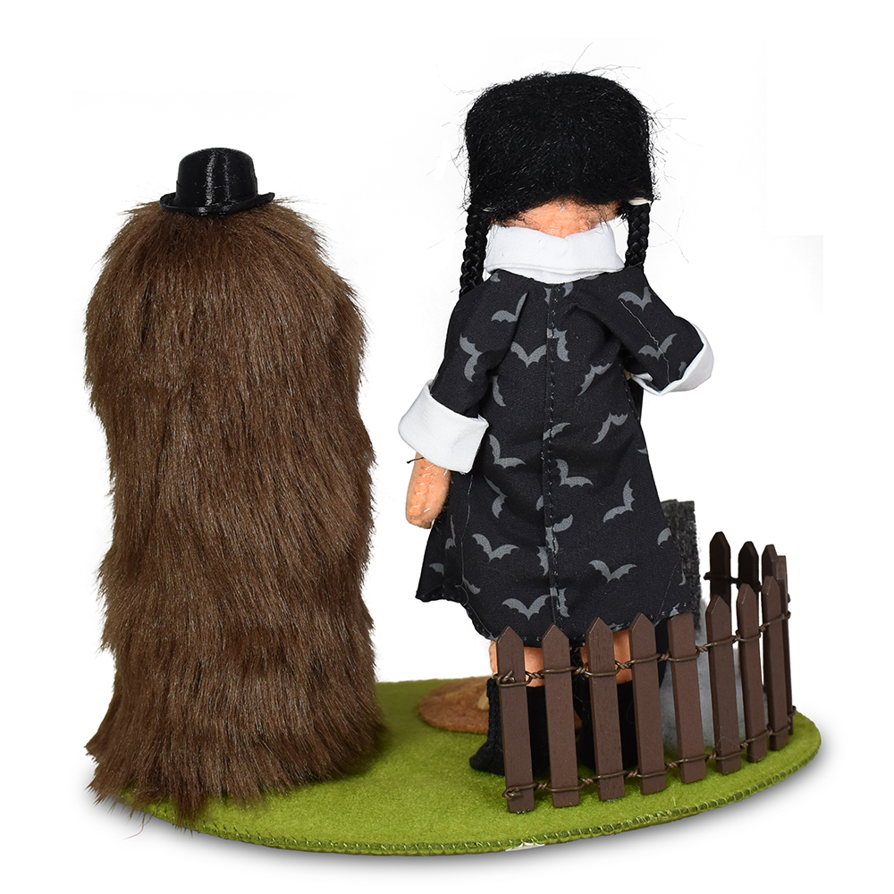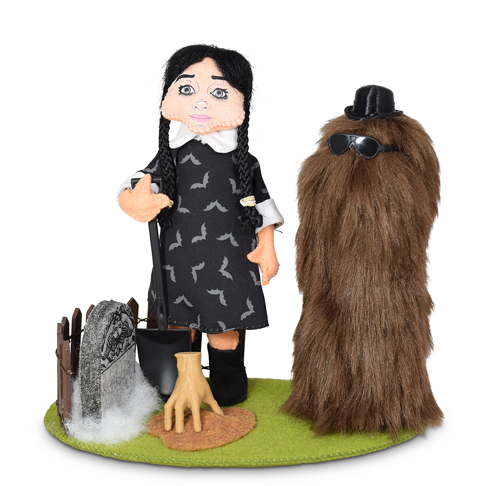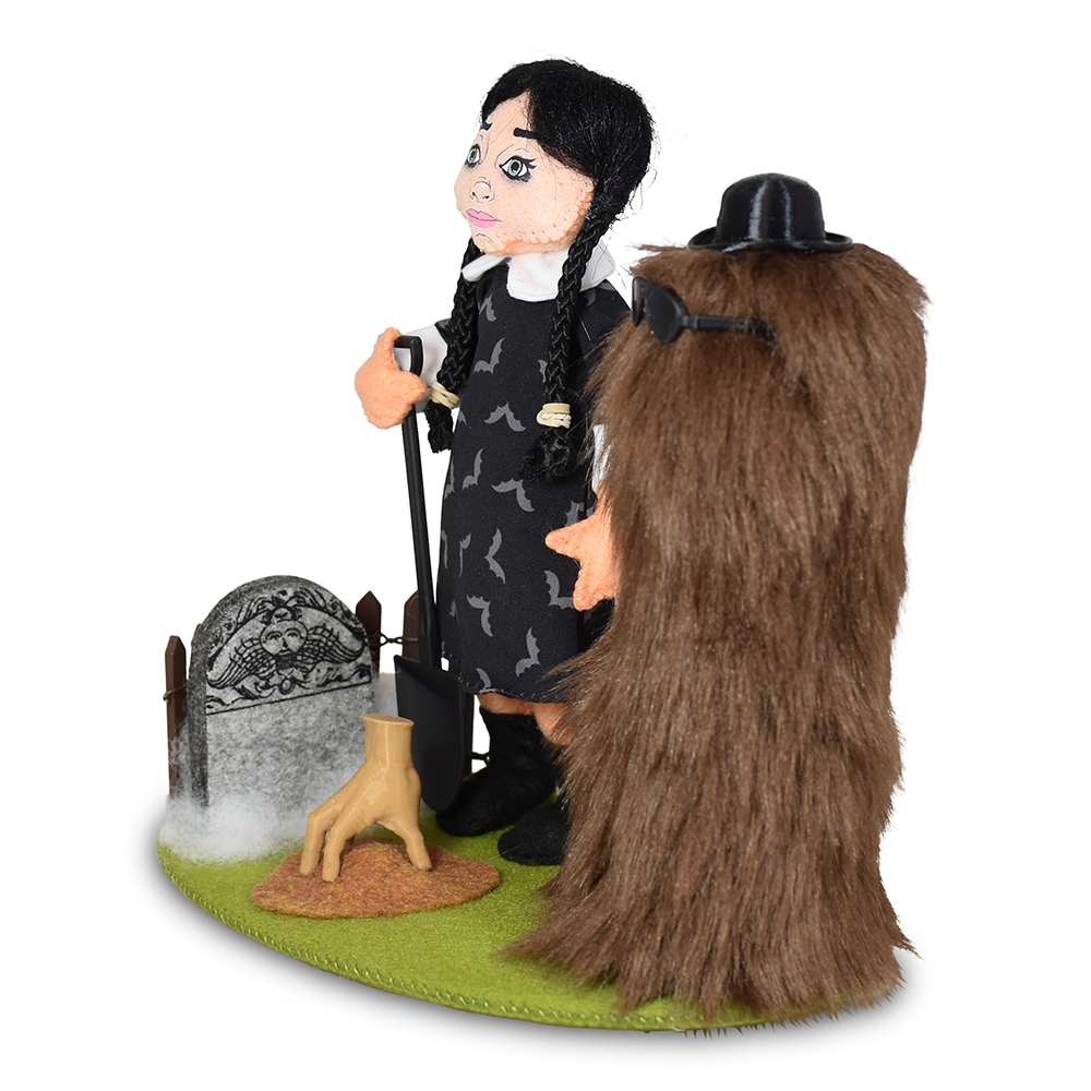 For those who find beauty in moonlit shadows and charm in the chill of a graveyard breeze, Darkly Devoted brings together three of the Addams Family’s most devoted darlings. Wednesday stands solemn and statuesque, her braided hair and unblinking gaze as steady as ever, while beside her, Cousin Itt rustles with an air of mysterious sophistication. At their feet, loyal Thing perches proudly atop a freshly turned mound of earth, keeping watch with a hand’s worth of devotion.