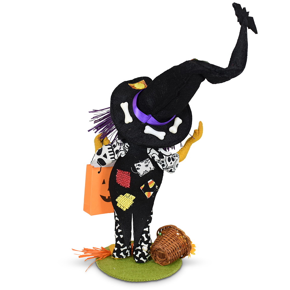 With a trusty trick-or-treat bag clutched in hand, this fanciful fellow is clearly ready to trade spooky stares for sweet confections. From his smile to his jaunty stance, Mr. Bone-jangles is less “fright in the night” and more “delight in the moonlight.” Every detail—from the swish of his raffia hair to the bold prints of his outfit—makes him a festive favorite who’s all about candy, charm, and just a hint of mischief.