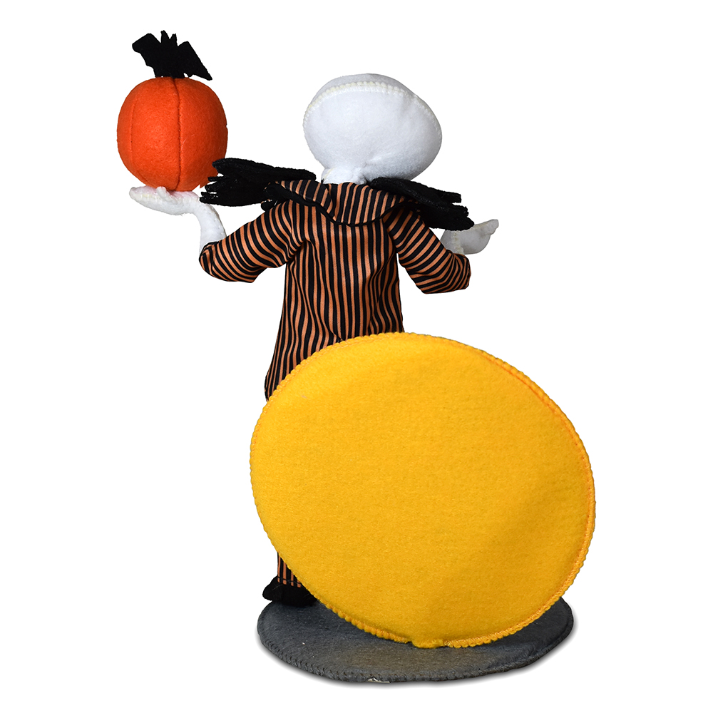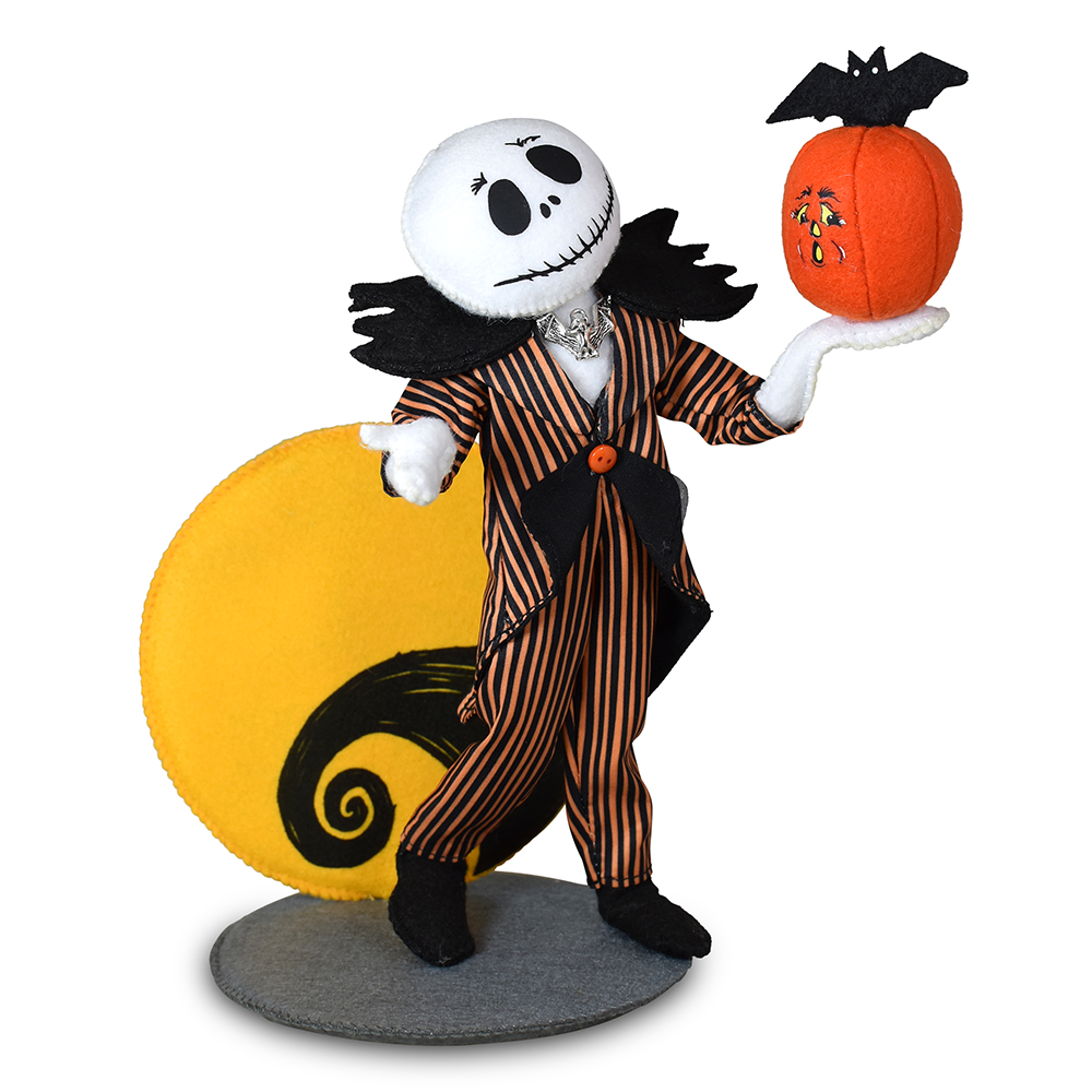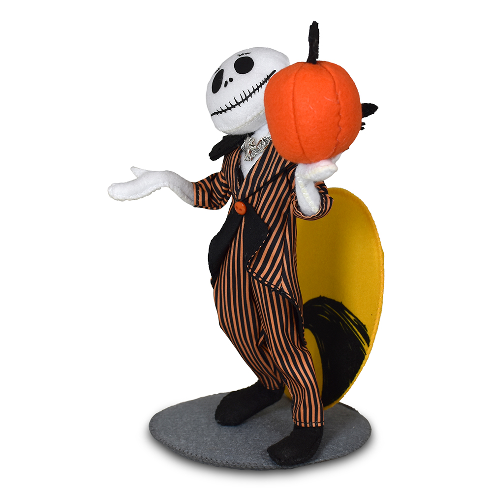 Step into the delightfully eerie world of Halloween Town with The Nightmare, an exclusive design that captures the playful mischief of the Pumpkin King himself. Jack Skellington stands tall and stitched to perfection, reimagined in a bold orange-and-black striped suit that sways with festive flair. In one hand he holds a bright jack-o’-lantern, crowned by a tiny felt bat that looks ready to take flight into the moonlit sky.