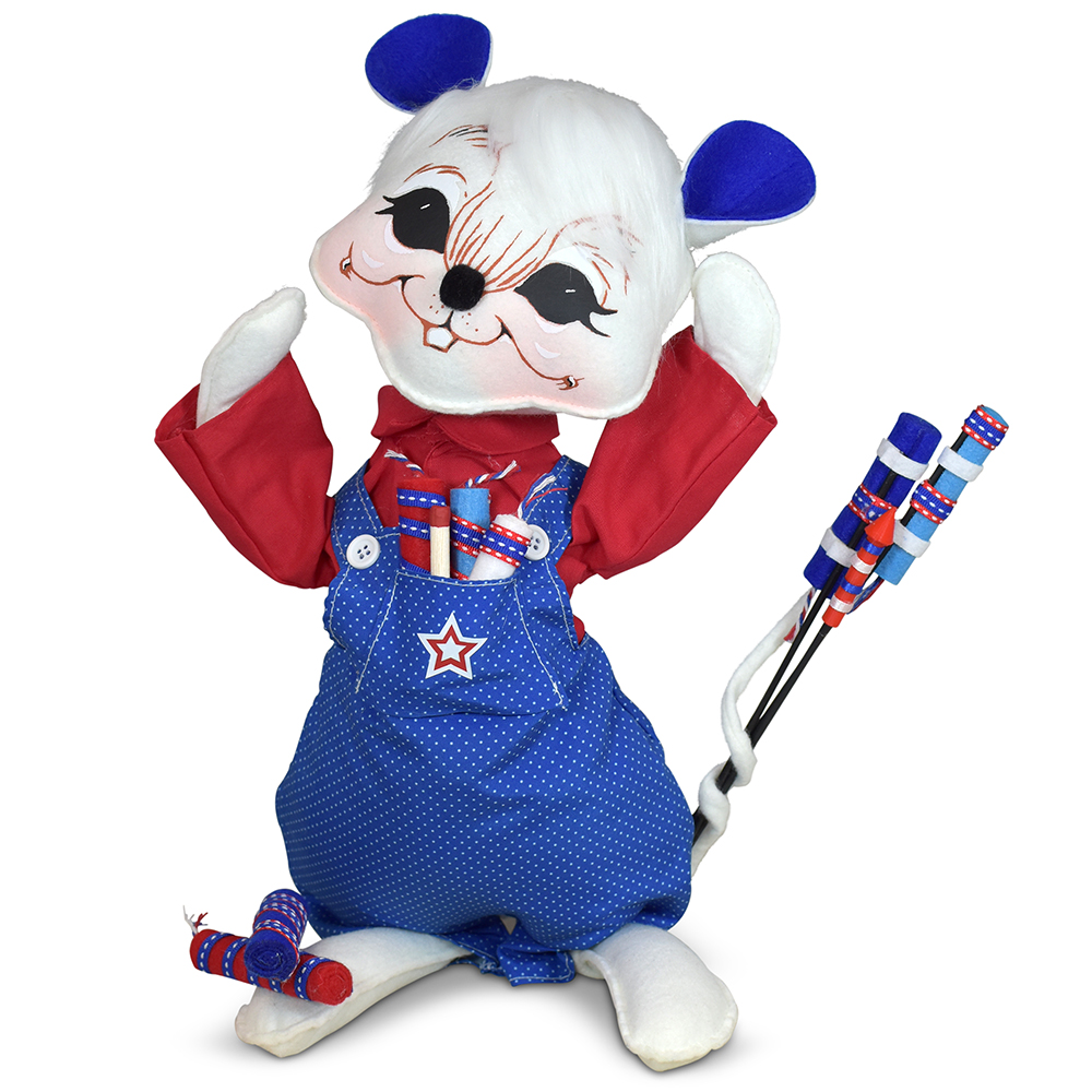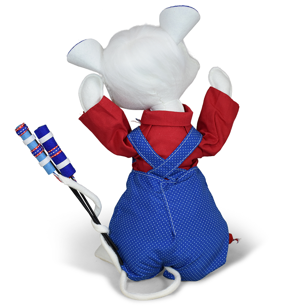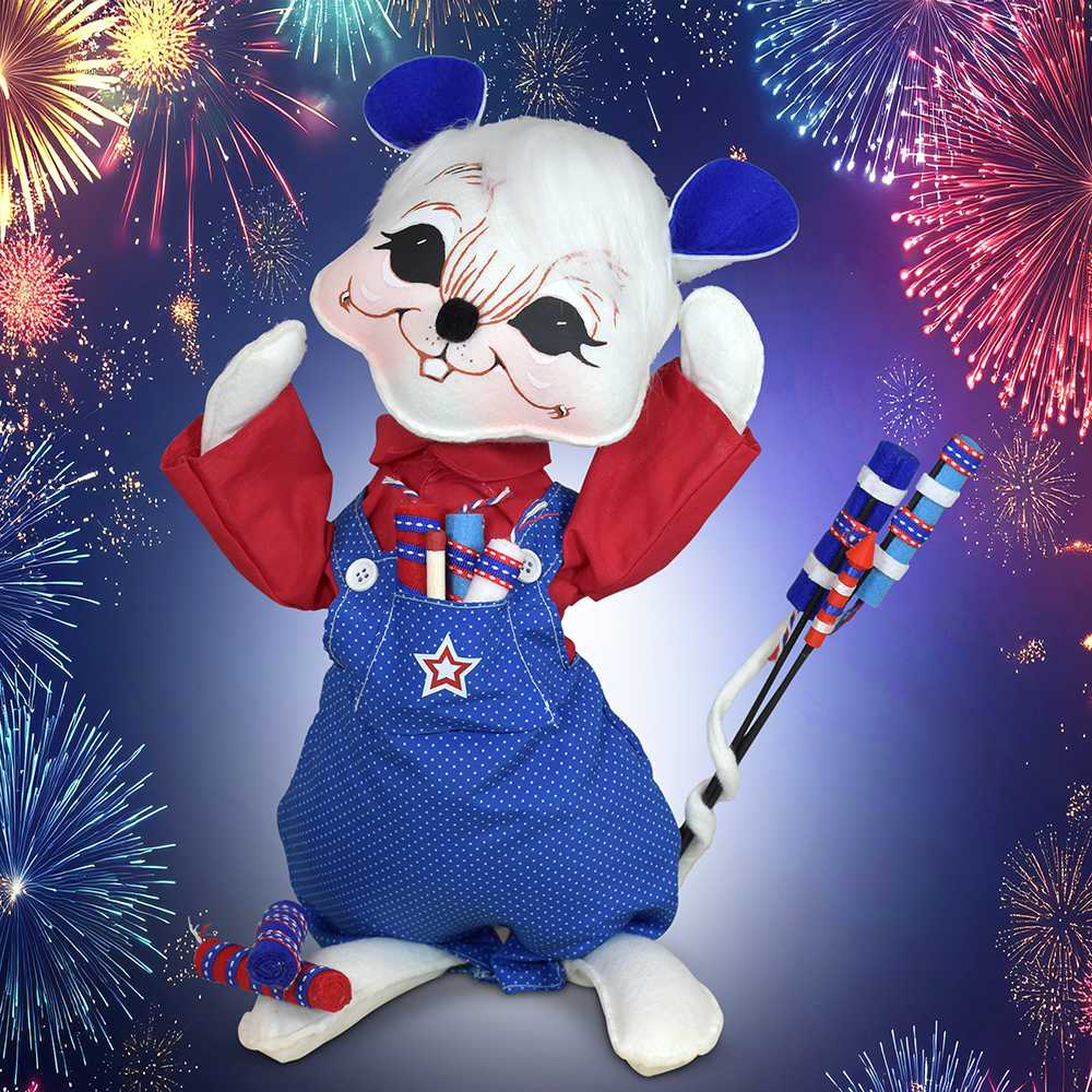Meet Fizzles the Firecracker Mouse—a patriot with a personality that pops! Dressed to dazzle in bright blue overalls and a bold red shirt, Fizzles is ready to ignite the spirit of celebration from whisker to tail.
