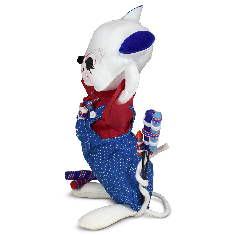 Tucked snugly in his overall bib are three red, white, and blue firecrackers (strictly for display—this mouse plays it safe!). Another bundle of firecrackers is cleverly wrapped in his curly tail, while another rests proudly atop his foot, like a grand finale waiting to happen.