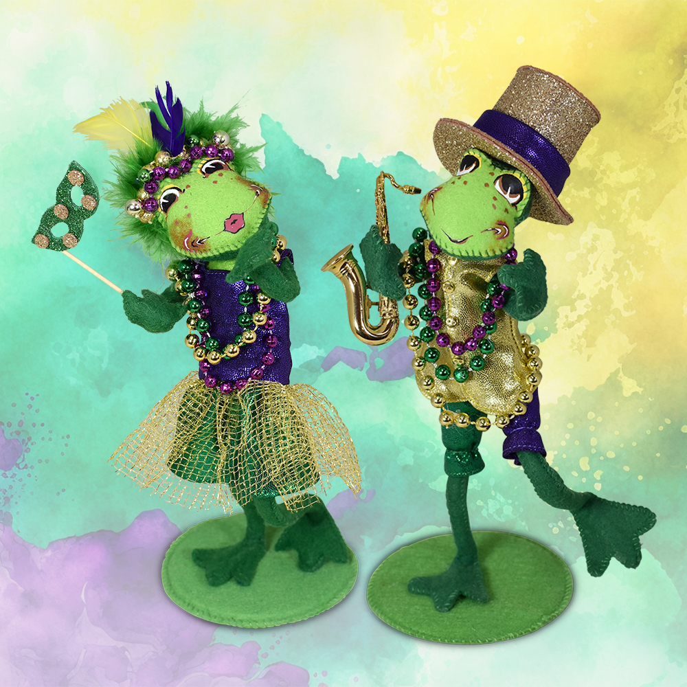 The dapper boy frog, in his shiny gold top hat, swings into celebration holding his shiny saxophone. His stylish counterpart strikes a playful pose with a classic Mardi Gras mask on a stick. Both frogs are adorned with vibrant celebration beads, adding extra sparkle and personality to their party-ready looks.
