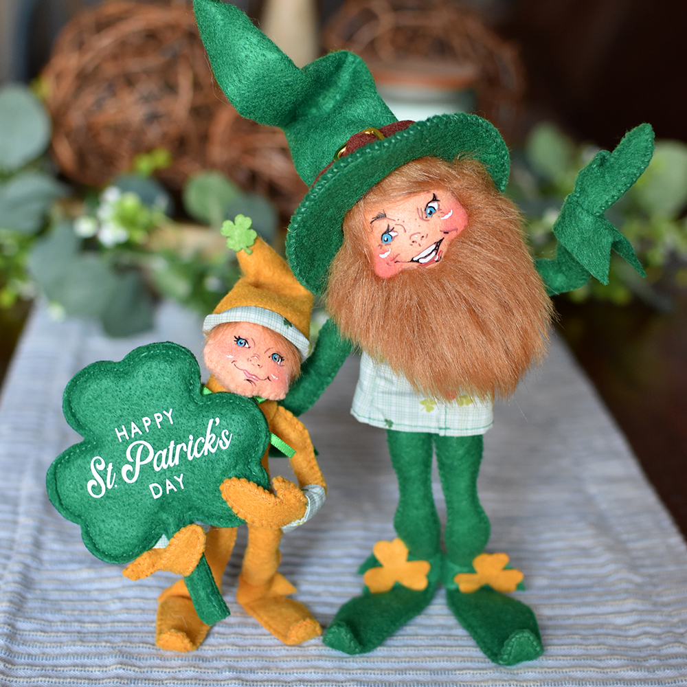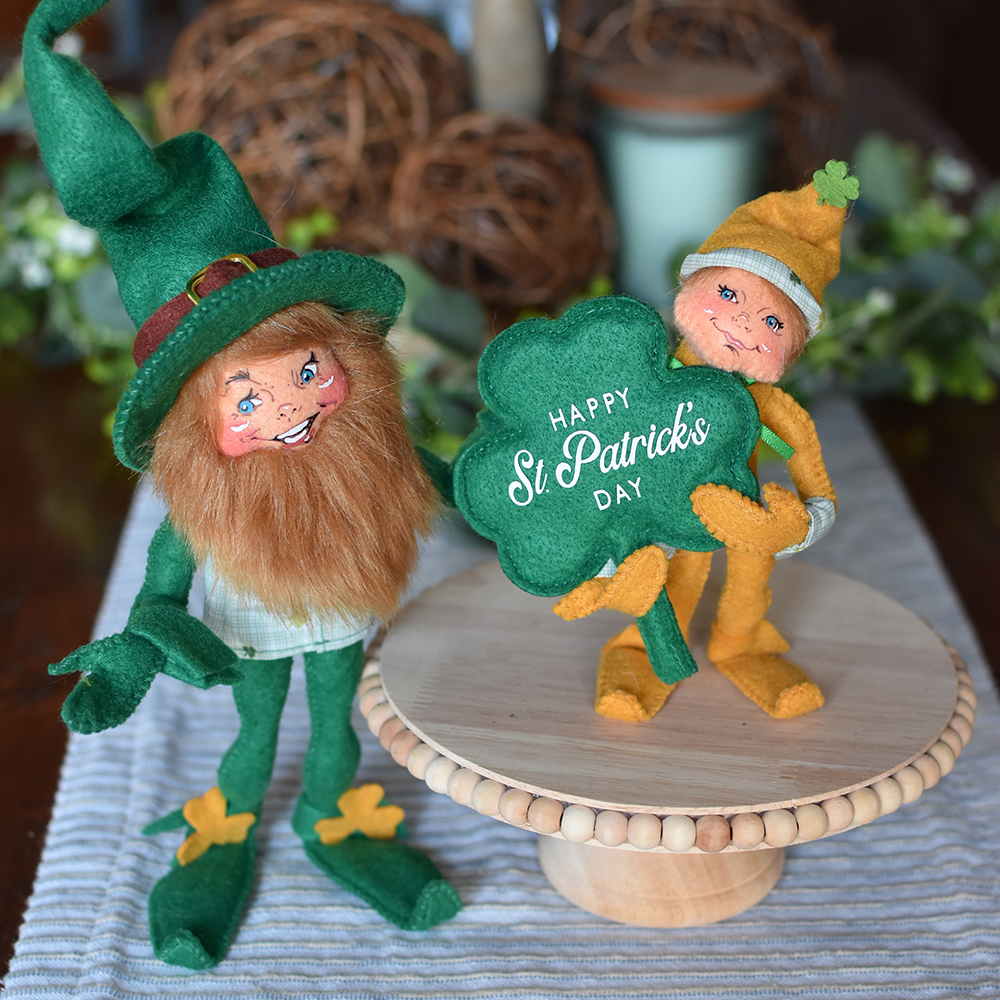Standing tall beside him is the 9in Lucky Leprechaun, a true guardian of good cheer. With a full, reddish-colored beard and a charming green print vest adorned with shamrock details, this classic character looks ready to lead the parade straight to the end of the rainbow. Together, they remind us that when luck is shared, it shines even brighter.