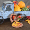 - The 3 inch turkey features brown feather boa on his head, colorful artwork on his wings and a multi-colored layered felt tail fan. He’s standing on a base accented with Autumn leaves.
