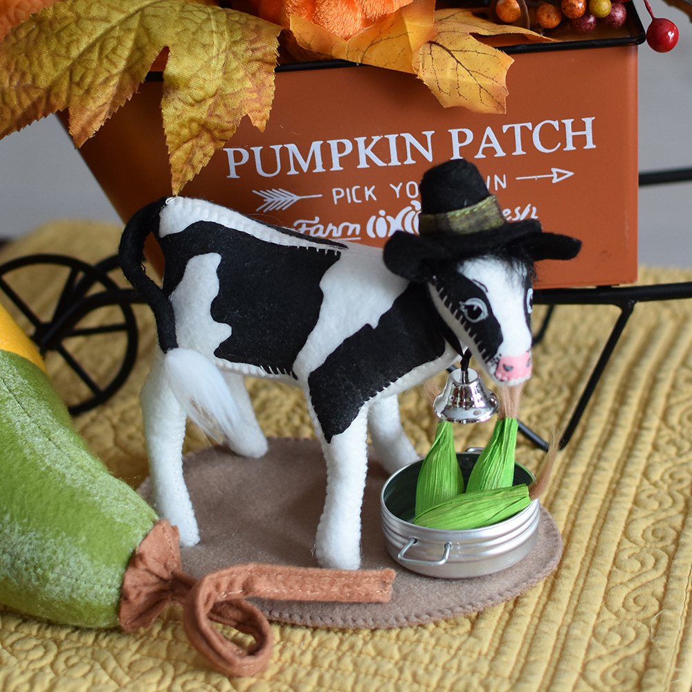 • Say hello to the 5-inch Harvest Cow – a delightful farmyard friend full of autumn charm. This detailed black an dwhite holstein is dressed for the season in a rustic farm hat with trim and a silver bell, ready to welcome the fall festivities.