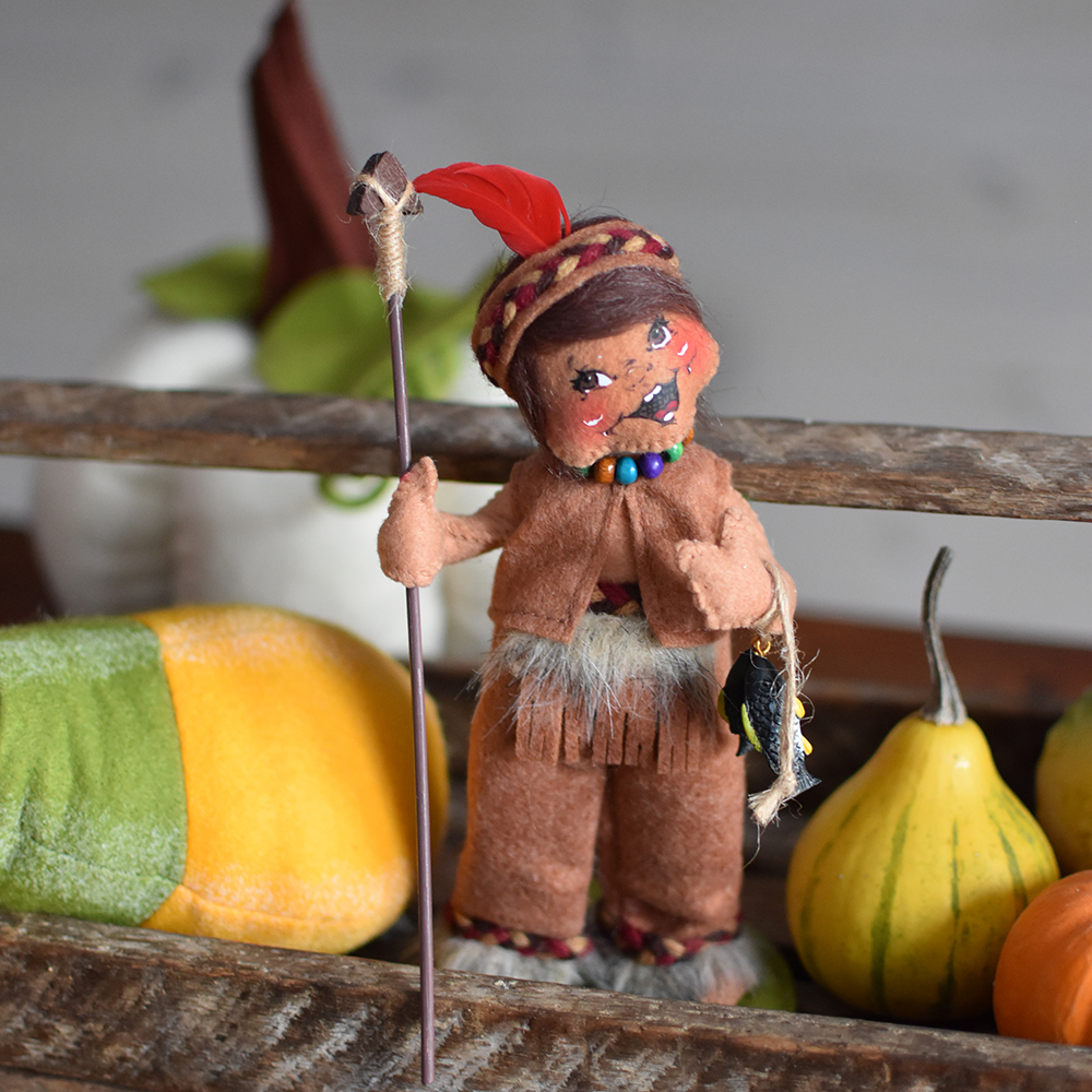 • Celebrate the richness of the season with this beautifully detailed 7in Native American Boy. Dressed in earthy brown tones, he wears a suede-like vest and fur-trimmed pants, with a feathered head wrap that adds a spirited touch.