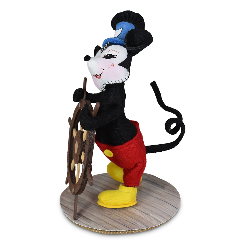 Dressed in his vintage sailor shorts, buttoned just so, and topped with a jaunty captain’s hat, our beloved black-and-white skipper is frozen mid-whistle, spinning the wheel like he’s got a river to charm and a tune to carry. His hands grip the helm, and his twinkle-toed stance suggests he might break into a tap dance at any moment.