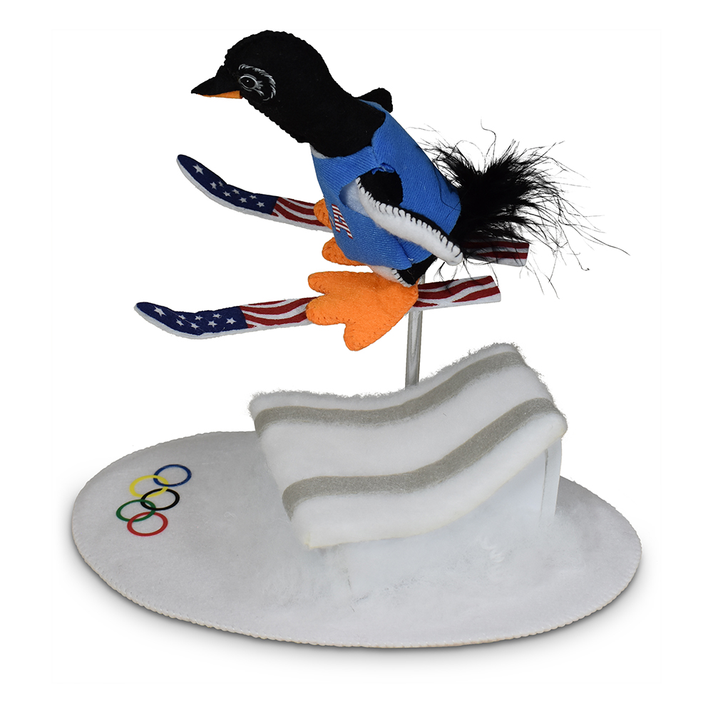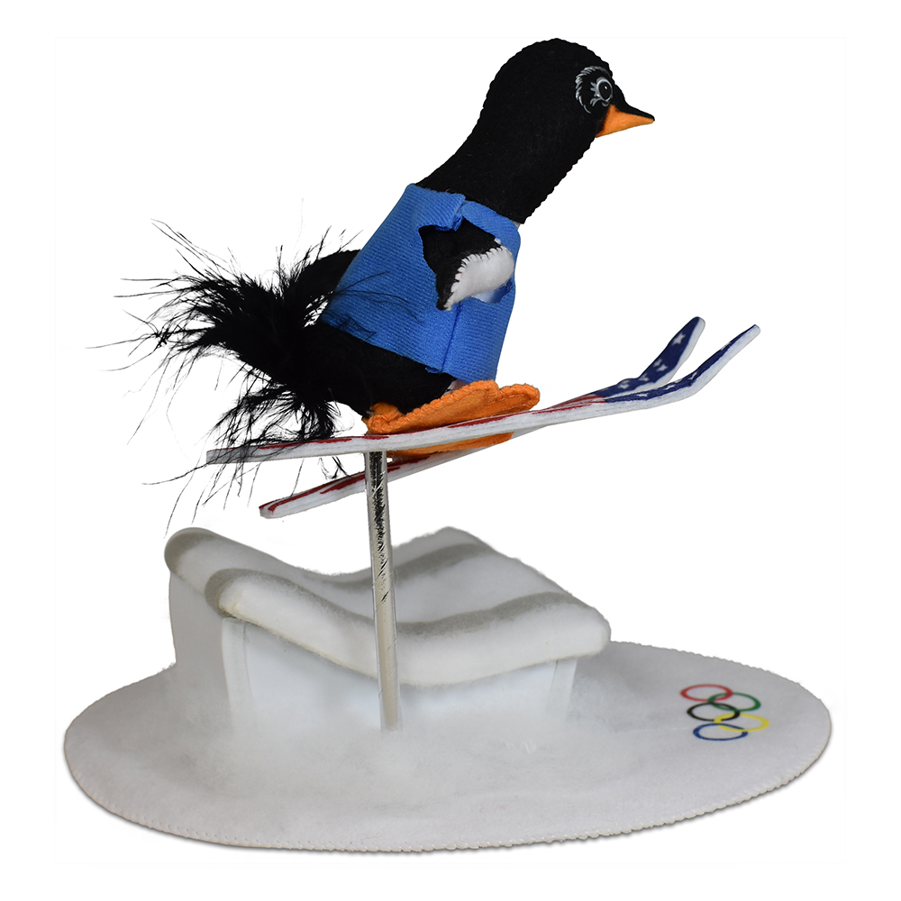 The iconic Olympic rings are screen-printed onto the base of the design. The penguin’s skis have an intricate red, white, and blue design screen-printed onto pressed felt. He wears a blue vest emblazoned with USA in the stars & stripes flag pattern on the front and the number 26 on the back indicating the year.