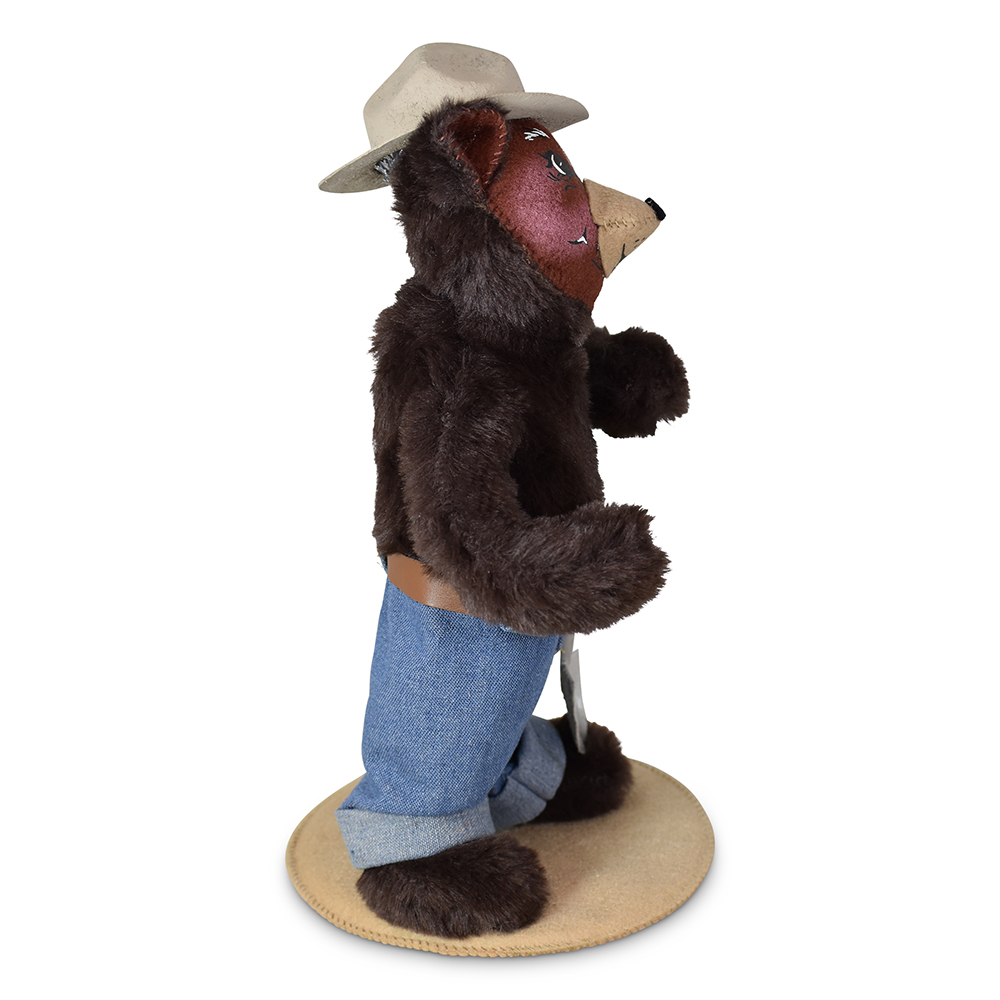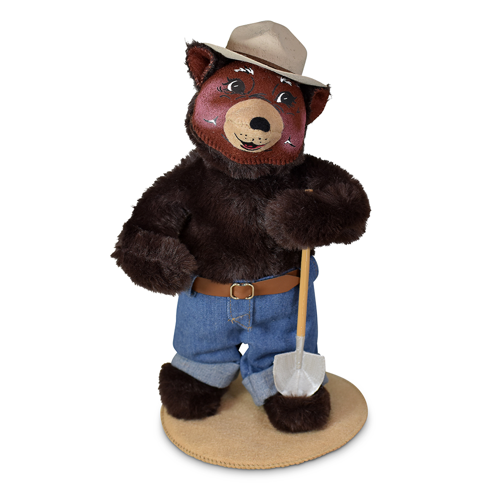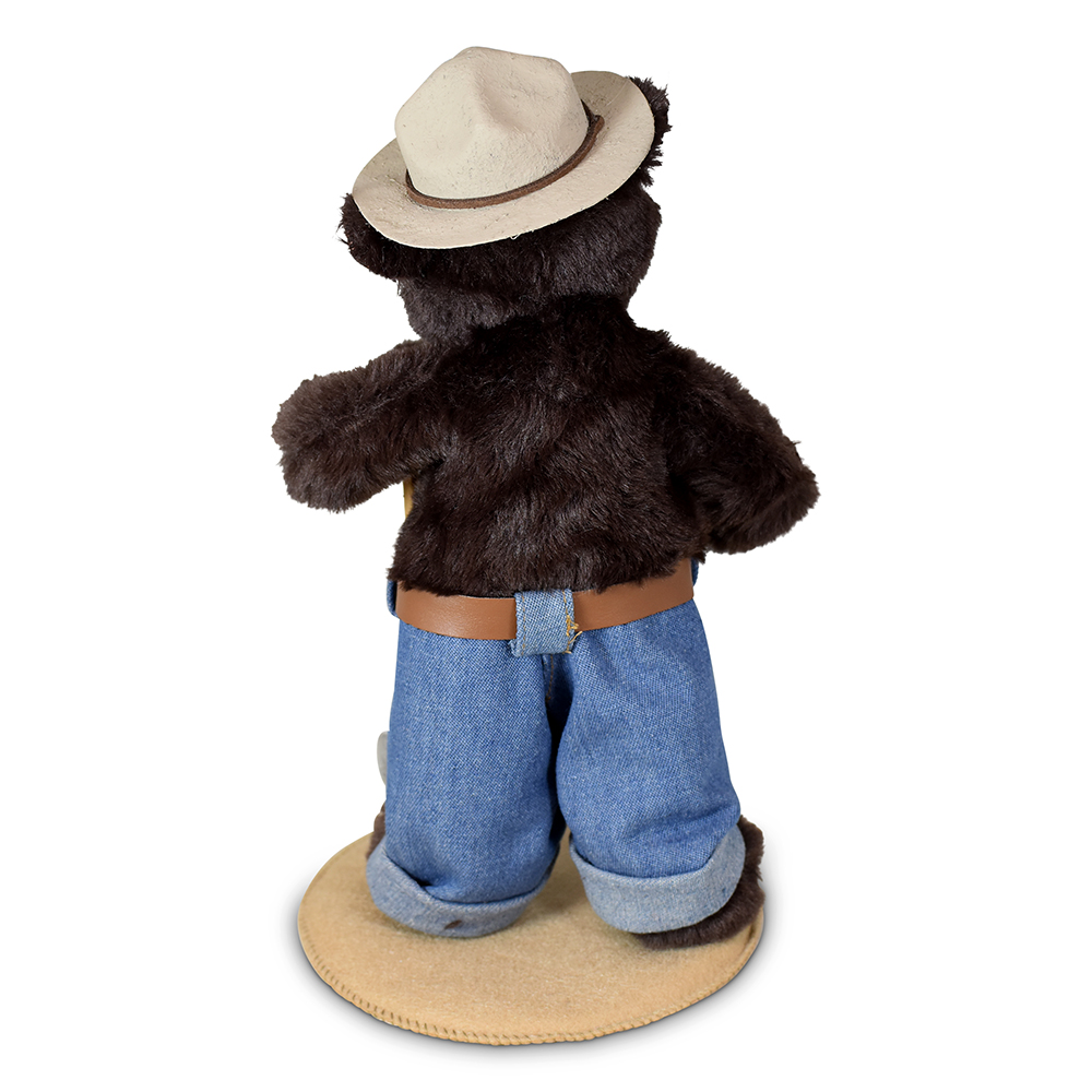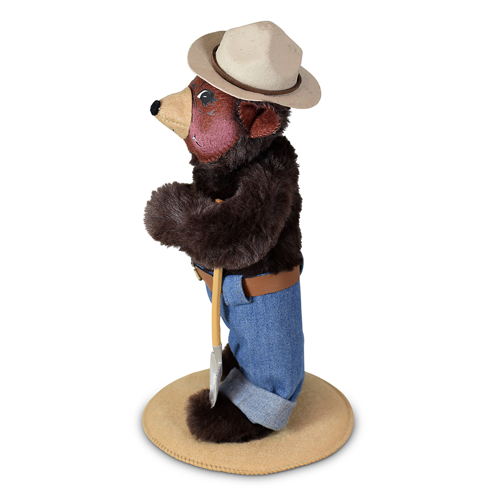 Dressed in classic blue jeans cinched with a brown belt, this friendly bear stands tall with a calm, watchful presence. His iconic tan fire warden hat sits proudly atop his head. In his paw, he carries a trusty shovel—always prepared to lend a helping hand in keeping the forest safe.