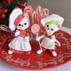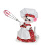 • The 6 inch white mouse wears a pretty dress made with our signature Holiday Sweets fabric, and a white chef hat and apron. She’s holding a whisk with a red and white mixture on the tip!