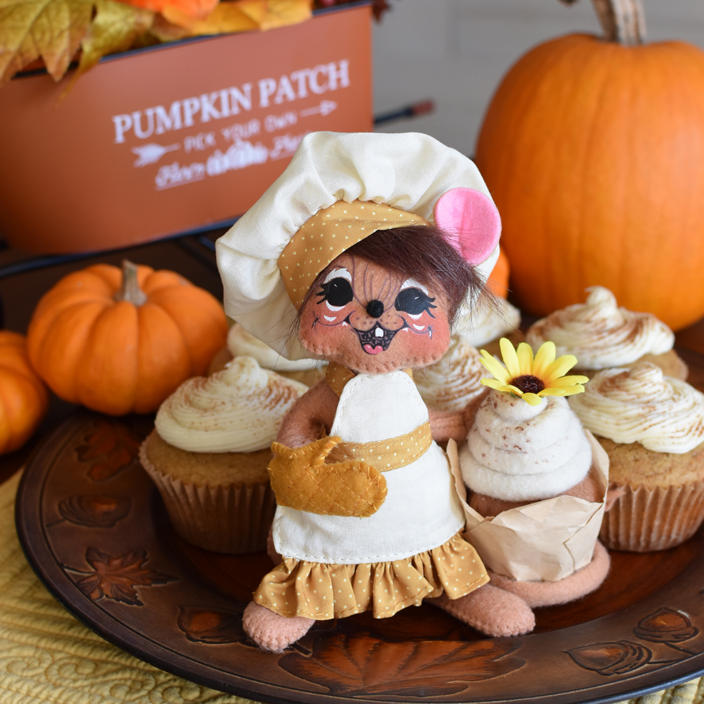 • The 6-inch Pumpkin Cupcake Chef is here to whisk up some autumn magic. Dressed in goldenrod and cream polka-dot fabric with charming kitchen-ready accessories—apron, hot mitt, and a classic chef’s hat—she brings warmth, elegance, and cozy seasonal cheer to any space.