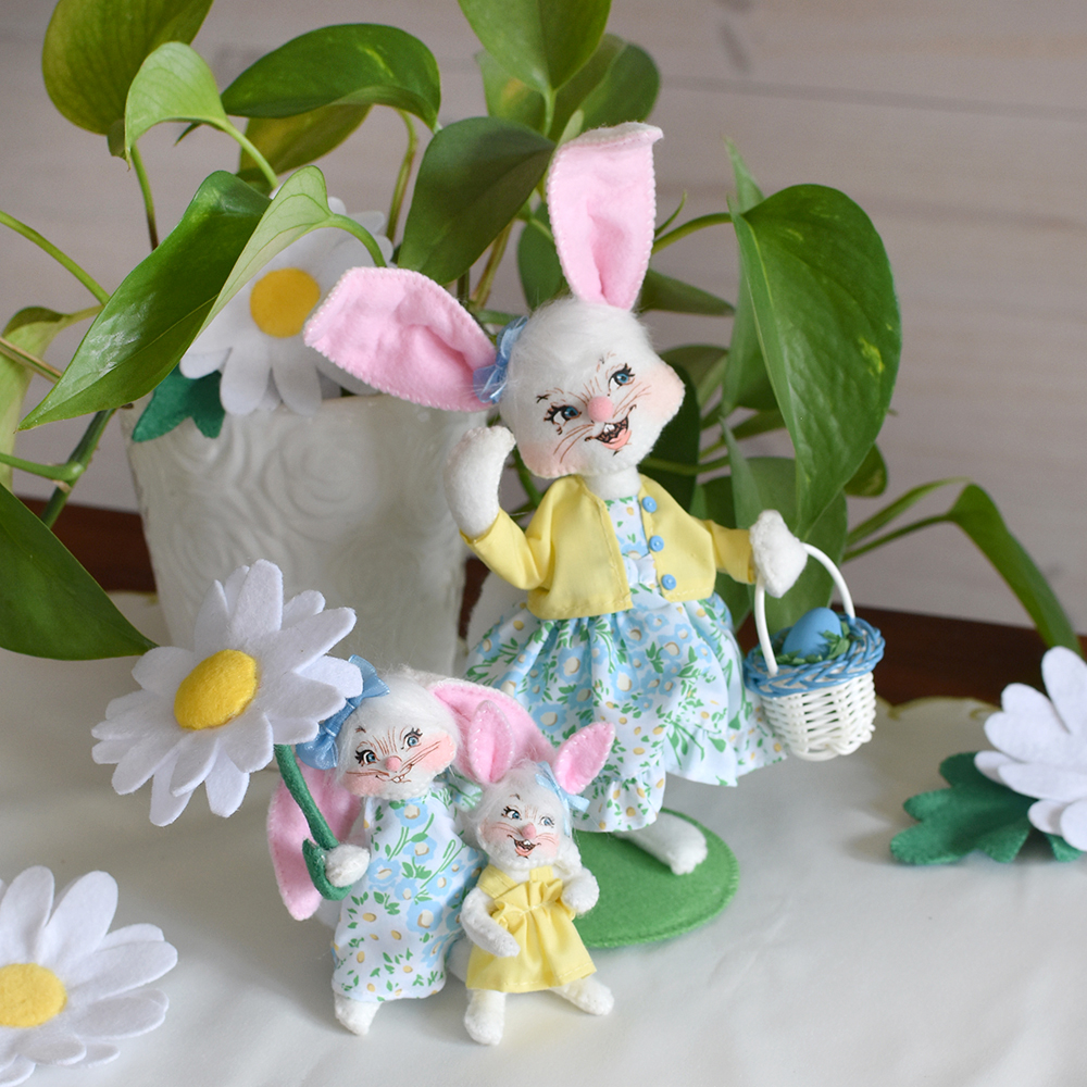- Set includes one each of the 3in Daisy Umbrella Bunnies, 6in Easter Parade Girl Bunny and Set of Daisy Blossoms.