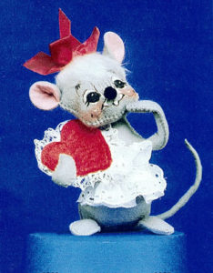 In the 1976 all-season catalog, Annalee introduced the 7-inch Sweetheart Mouse. She was made of gray felt and featured an eyelet skirt. This big-hearted design was a favorite in the A Mouse for Every House Collection.